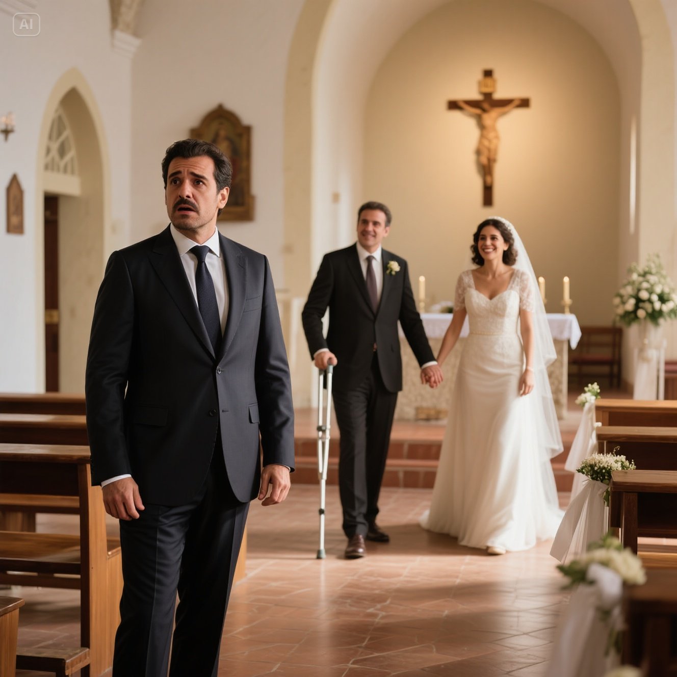 En nuestro último año, Emilio había sufrido un terrible accidente que le costó una pierna. Recuerdo mi visita al hospital, llena de compasión superficial y prisas por irme. Después de eso, le perdí la pista. Y ahora estaba allí, de pie en el altar sobre una sola pierna y una prótesis, sonriendo. Sostenía la mano de Antonia con una devoción que llenaba todo el espacio.