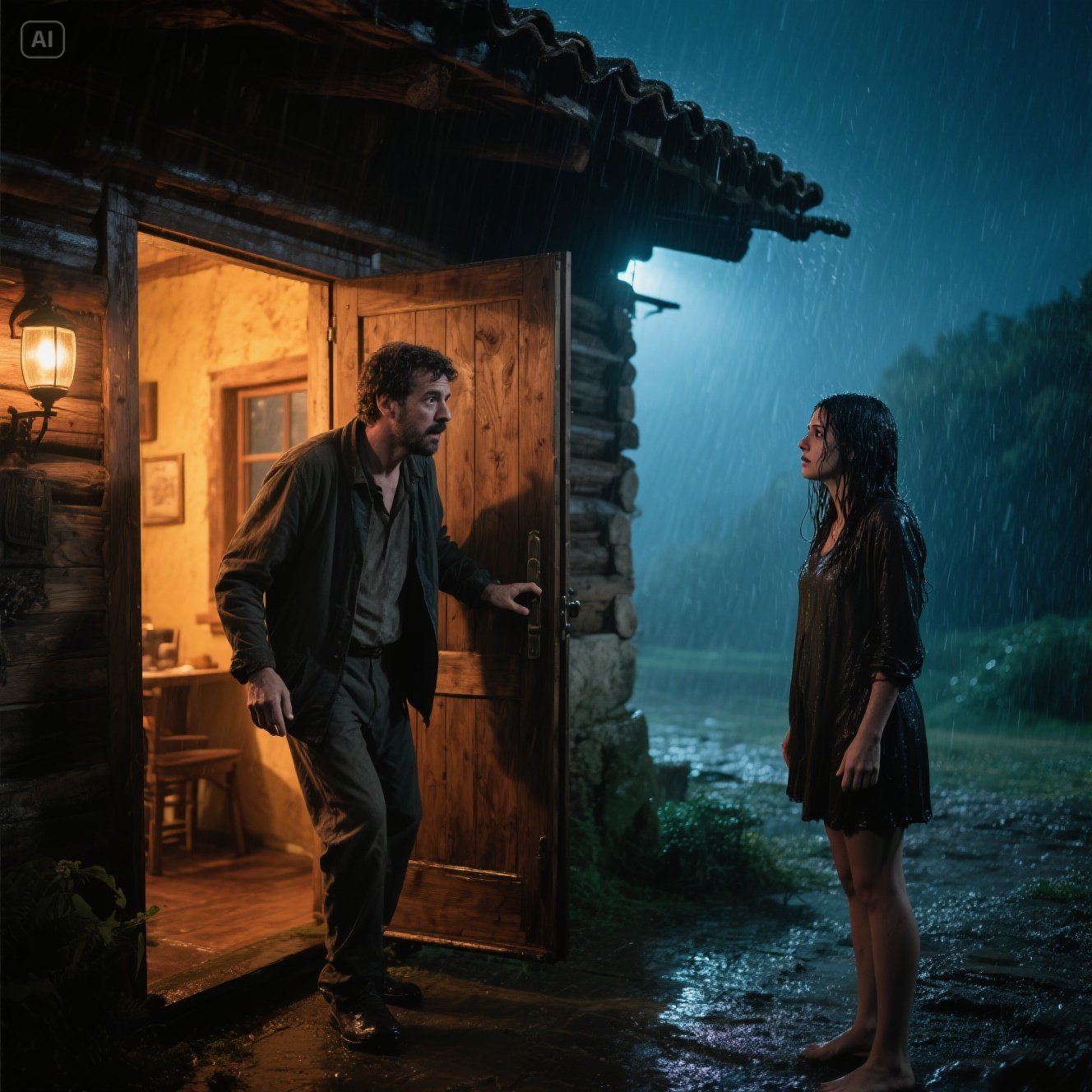 Al abrir, se encontró con una figura empapada, temblorosa y vulnerable. Era una mujer joven, con el pelo oscuro pegado a la frente y los labios morados por el frío. Sus ojos, grandes y asustados, lo miraron con una súplica desesperada. “Por favor…”, susurró, con la voz entrecortada por el agotamiento y el frío. “Mi coche se averió en la curva. Necesito refugio. Solo hasta que pase la tormenta”.