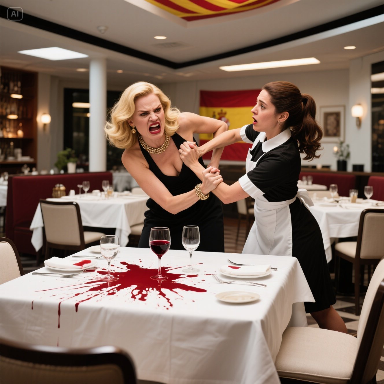 “¡No te atrevas a tocarme!”, espetó, levantándose dramáticamente. “¿Tienes idea de cuánto costó este vestido? Vas a pagar por esto, patética camarerucha”.